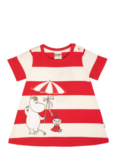 En mjuk och skön Mumin klänning för baby. A-linjeformad med kort ärm, rund halsringning och tryckknappar på ena axeln. Produkten innehåller certifierad ekologisk bomull.