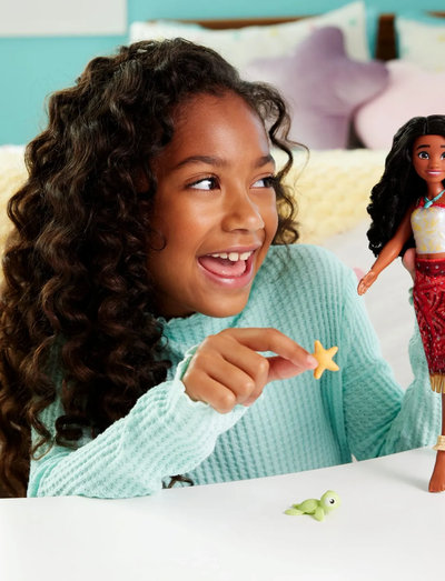 Barnen kommer att älska att drömma om oändliga havsäventyr med modedockan Tautai Vaiana som simmar, inspirerad av Disneys Vaiana 2, uppföljaren till originalfilmen. Som den modiga ledare hon är är hon redo att utforska land och hav. Hon är klädd i sina äventyrskläder från filmen, med halsband, vristlänk, kjol och överdel som ändrar färg tillsätt bara varmt vatten för att aktivera! Hennes långa, lockiga hår är rörligt liksom hennes ledade armar, huvud och ben som sparkar i vattnet med ett tryck på knappen i Vaiana-dockans midja. Ingen havsresa är komplett utan kompisar en sköldpadda och en sjöstjärna! Dockorna kan inte stå själva. Färger och dekorationer kan variera.