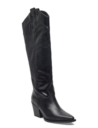 Dessa höga stövlar har en klassisk, västinspirerad silhuett med en spetsig tå och en robust blockklack. Det knähöga skaftet ger en dramatisk touch, vilket gör dem till ett mångsidigt val för olika outfits.
