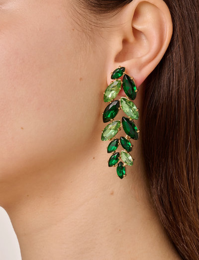 BANYAN – Ett extraordinärt örhänge, prydd av inte mindre än tolv navette-formade fasetterade kristaller i ett kontinuerligt mönster som skapar en illusion av kristallblad som smeker din halsringning. En verkligt magnifik design. Tillverkad av polerad mässing – total längd 60 mm och säkrad med en öronstift i kirurgiskt stål. Här visas i guldfärgat i et mix av olika smaragdgröna kristaller. Dansk design i en nickelfri finish.