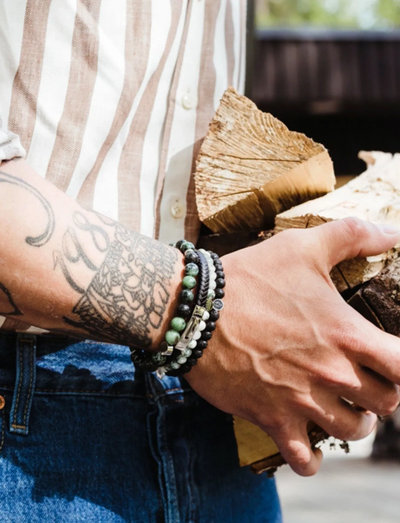 Denna kurerade presentförpackning erbjuder en komplett och stilfull look med tre kompletterande armband. Setet inkluderar ett pärlarmband med trädagat, känt för sina lugnande egenskaper och unika mönster. Ett flätat svart läderarmband tillför en touch av tidlös elegans, komplett med ett spänne i rostfritt stål. Setet avrundas av ett armband med imperial jaspis, vars jordnära toner påminner om lugna skogar. Levereras i en exklusiv presentförpackning, vilket gör det till en perfekt present eller en välförtjänt gåva till dig själv.