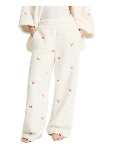 Fleecebyxor designade för komfort under kyliga kvällar. Dessa mysiga byxor har fina, hjärtformade broderier som ger en söt touch till dina myskläder.