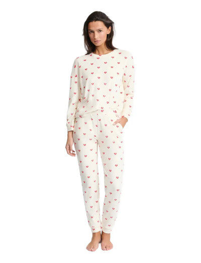 Njut av en vilsam natt i detta tvådelade pyjamasset. Den långärmade toppen och de matchande underdelarna har en mjuk finish med sammetseffekt och ett allover-hjärtmönster för extra charm.