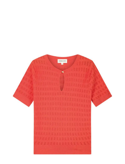 Denna kortärmade stickade tröja har en nyckelhålsringning med knappstängning och ger en ventilerande, texturerad känsla. Det genomgående stickmönstret ger visuellt intresse till denna bekväma topp.