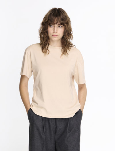 Loose fitted Tee with rib in neck line and flatlock detail.
