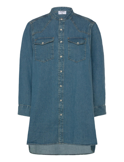Den här denimskjortklänningen har detaljer i westernstil med ok fram och bak, vilket ger en modern twist till en klassisk silhuett. Den har en ståkrage, en formad fåll och påsydda fickor på bröstet, och är avslutad med tryckknappar i pärlemor.
