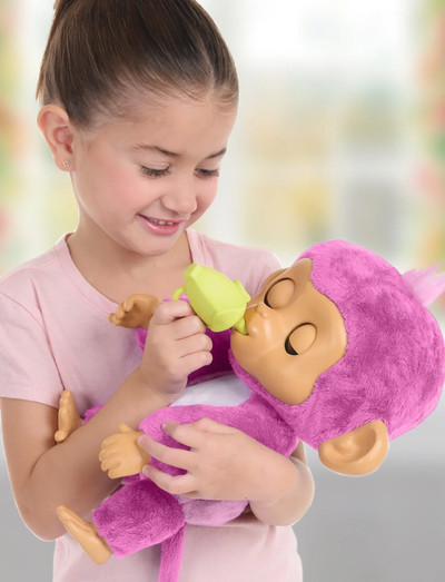"Fingerlings Care 'n' Cuddles Interaktiv Babyapa är den gulligaste vännen som de minsta kan ta hand om. Harper är en söt. rosa babyapa med mjuk päls. en kramvänlig kropp och ett hjärta som lyser i regnbågens färger.