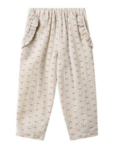 Dessa mjuka bomullsbyxor har ett lekfullt tryck med vågor och hjärtan, vilket ger ett bekvämt och stilfullt alternativ. Designade med en elastisk midja för en flexibel passform, och inkluderar även praktiska sidfickor. Den lösa passformen säkerställer rörelsefrihet, vilket gör dem idealiska för vardagsbruk.