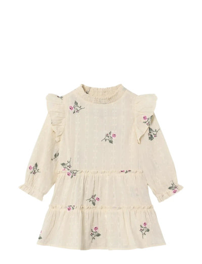 Denna långärmade klänning är tillverkad i mjuk vävd bomull och har vackra broderade rosor. Klänningen är designad med puffärmar med elastiska muddar och en volang vid axlarna. Klänningen har två paneler med rynk och en liten volangdetalj som ger den ett luftigt och elegant fall.
