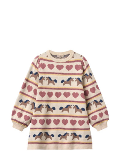 Denna stickade klänning har ett charmigt häst- och hjärtmönster och en avslappnad passform. Den är designad med lätt puffärm och ribbade kanter vid halsringningen, ärmarna och fållen, vilket ger en bekväm och flexibel passform. Perfekt för både vardagsbruk och speciella tillfällen under de kallare månaderna. Denna artikel innehåller LENZING™ ECOVERO™ viskos. Viskos är ett naturmaterial. Fibrerna som används för att tillverka LENZING™ ECOVERO™ viskos utvinns genom ansvarsfullt skogsbruk och produceras på ett sätt som har en lägre miljöpåverkan än konventionell viskos.