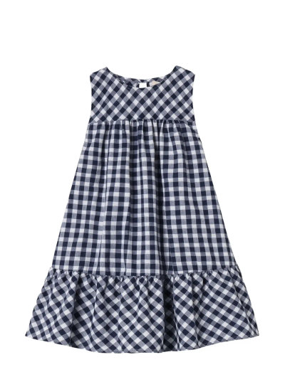 Den här ärmlösa klänningen har ett charmigt rutmönster. Sömmar vid bröstet och höften ger mer volym. En detalj med snörning baktill gör den enkel att ta av och på. Den är gjord av mjuk bomull.