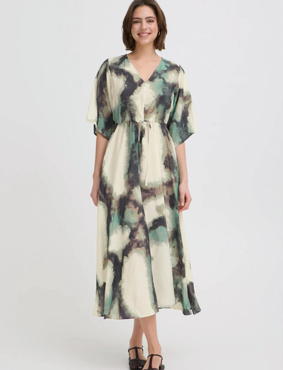 Denna maxiklänning har en flytande silhuett och en avslappnad passform. Den har korta ärmar och en V-ringning, som kompletteras av ett midjeband för en justerbar form.
