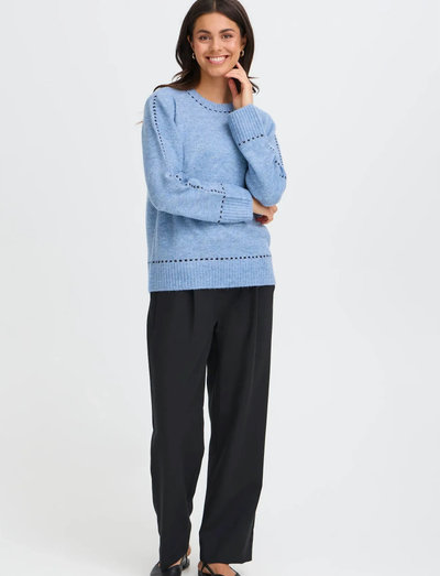 Denna tröja har en avslappnad silhuett och subtila detaljer vid halsringningen och fållen. Den mjuka stickningen gör den till ett bekvämt val för vardagsbruk.