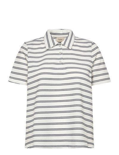 Denna topp har en klassisk polokrage och korta ärmar, vilket ger den en tidlös silhuett. Det subtila horisontella randmönstret tillför ett visuellt intressant element, vilket gör den till ett mångsidigt tillskott till varje garderob.