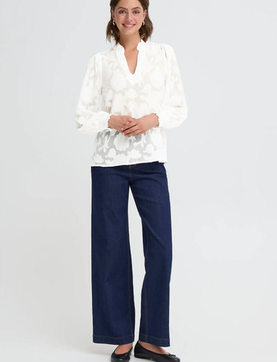 Denna långärmade topp har ett subtilt blommönster som ger en feminin touch. Designen har en hög hals med volanger och elastiska muddar, vilket ger en elegant touch till den avslappnade silhuetten.