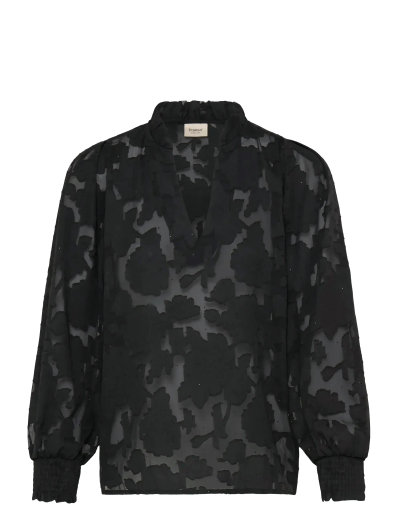 Denna långärmade topp har ett subtilt blommönster som ger en feminin touch. Designen har en hög hals med volanger och elastiska muddar, vilket ger en elegant touch till den avslappnade silhuetten.