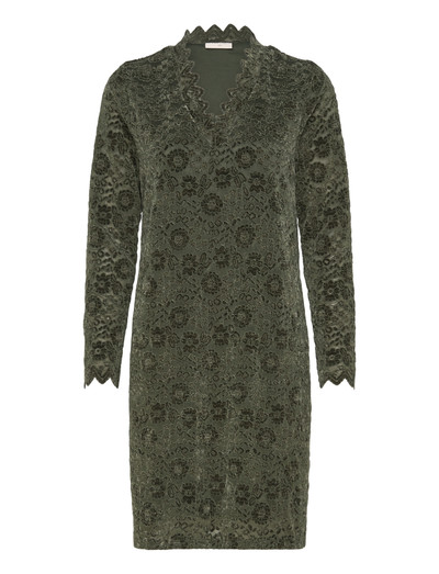 Denna klänning är tillverkad i mjuk 3D-jersey och spets, vilket ger ett bekvämt och stilfullt alternativ. Den har en smickrande, smal passform, långa ärmar och eleganta spetskanter i V-ringningen och vid ärmsluten.
