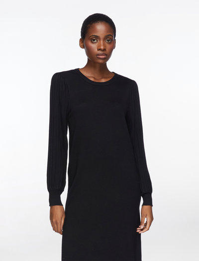 Denna klänning är tillverkad i ett mjukt, fint stickat material och har en enkel silhuett. De långa ärmarna har en ribbad textur som ger en detalj till den minimalistiska designen.
