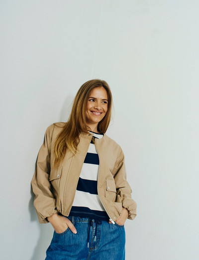 Bomber jacket from Freequent in a soft material. The jacket has a simple silhouette with a concealed button fastening, front pockets with utility references, a seam detail across the back and an elasticated hem at the bottom and in the long sleeves.