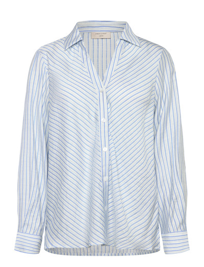 Shirt from Freequent in a light material with a striped print. The shirt has long sleeves with cuffs, V-neck with a collar, a front button fastening as well as an elegant, loose fit.
