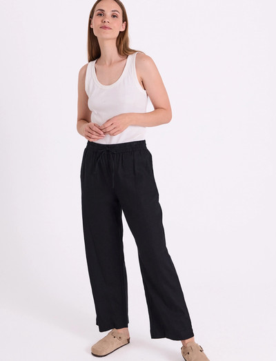 Dessa vida byxor är gjorda av en bekväm blandning av linne och viskos. De har ett elastiskt midjeband med dragsko för en perfekt passform. Byxorna har en avslappnad passform och ett brett ben, vilket gör dem perfekta för både avslappnade och eleganta tillfällen.