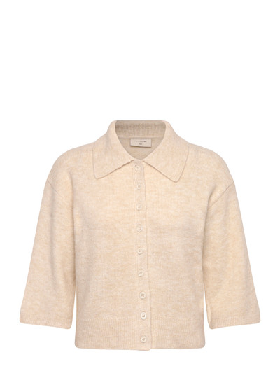 Denna cardigan är tillverkad i ett mjukt stickat material och erbjuder ett bekvämt och stilfullt lager-på-lager-alternativ. Den har en knäppning framtill, en bred krage och eleganta trekvartsärmar, vilket gör den till ett mångsidigt tillskott till varje garderob.