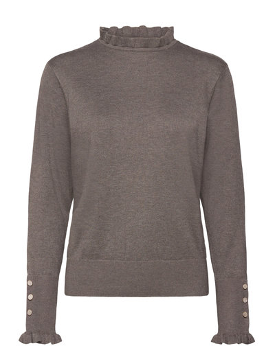 Denna pullover är tillverkad i ett mjukt, fint stickat material och är ett bekvämt och stilfullt val för kyligare dagar. Den har en enkel design, som framhävs av fina volanger vid halsen och ärmsluten, vilket ger en elegant touch.