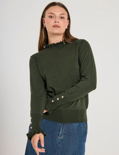 Denna pullover är tillverkad i ett mjukt, fint stickat material och är ett bekvämt och stilfullt val för kyligare dagar. Den har en enkel design, som framhävs av fina volanger vid halsen och ärmsluten, vilket ger en elegant touch.