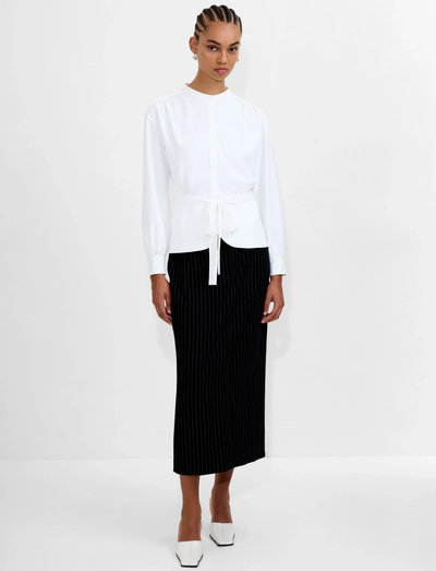 Denna långärmade skjorta har ett knytband i midjan för anpassad passform. Designen har en bandkrage och knäppning framtill, vilket ger en sofistikerad touch till detta mångsidiga plagg.