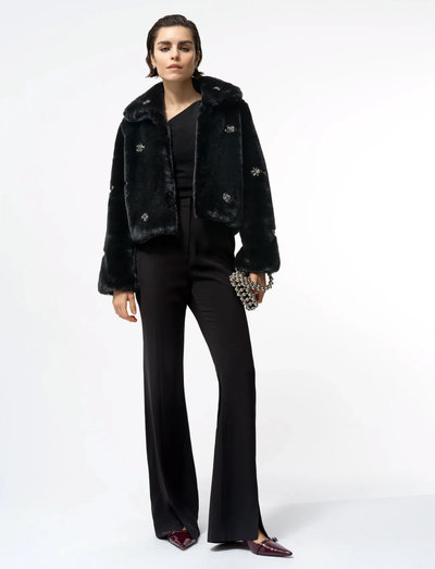 Ge din ytterklädeskollektion en touch av glamour med denna korta jacka i fuskpäls. Designen har utsmyckningar som fångar ljuset och ger din look en subtil glans. Den croppade längden gör den till ett mångsidigt plagg som kan bäras över klänningar eller tillsammans med högmidjade byxor.