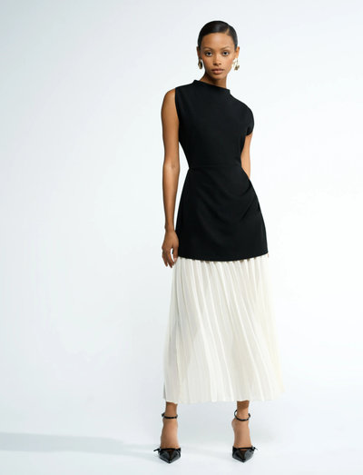 Denna klänning erbjuder en modern silhuett med en elegant överdel som kontrasterar vackert mot den plisserade kjolen. Designen innehåller subtila detaljer för att förstärka dess övergripande utseende.