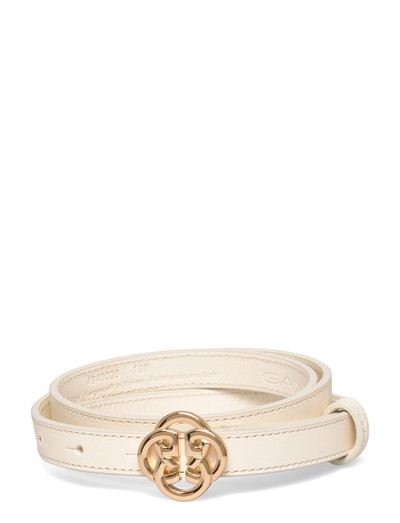 Ett smalt läderbälte med ett monogramspänne ger en sofistikerad touch till varje outfit. Kontrastdetaljer och en präglad logotyp på spännet fulländar denna stilfulla accessoar.