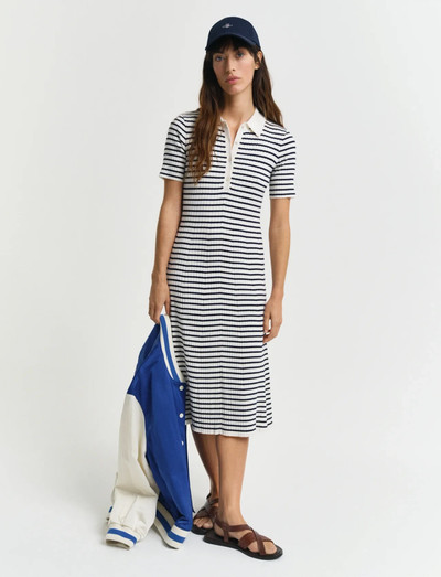 Den här randiga klänningen är ett klassiskt plagg som kan stylas upp eller ner. Den har ett ribbat stickat tyg och en smickrande A-linje silhuett. Klänningen har en krage och en knappslå.