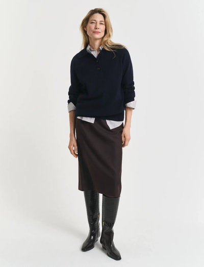 Denna stickade rugger är skapad för komfort och har en avslappnad silhuett. Designen har ribbade detaljer i halsen, ärmsluten och fållen, vilket ger en klassisk touch. Om du föredrar en mer åtsittande look kan du överväga att beställa en storlek mindre. För att bevara kvaliteten bör den tvättas ut och in med liknande färger och ett ullspecifikt tvättmedel, och formas sedan medan den är fuktig.