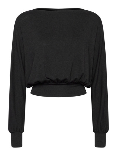 Denna topp har en bred båtringning och en lätt croppad längd, vilket ger en avslappnad silhuett. De långa ärmarna avslutas med åtsittande muddar, medan fållen är elastisk för en bekväm passform.