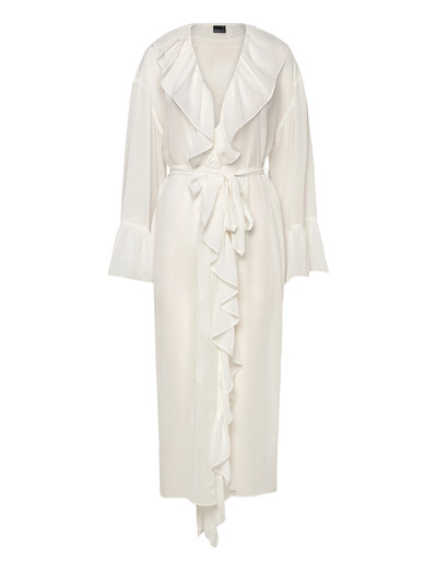 Denna morgonrock är tillverkad i lätt chiffong och erbjuder ett bekvämt och elegant loungewear-alternativ. Den har en böljande silhuett, accentuerad av fina volanger längs framsidan och ett knytband i midjan för anpassad passform. De utsvängda ärmarna ger en sofistikerad touch till detta avslappnade plagg.