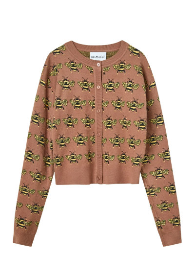 Denna stickade cardigan har ett lekfullt bimotiv och ger en touch av lekfullhet till vilken outfit som helst. Den croppade silhuetten gör den idealisk för lager-på-lager, medan knappdesignen ger en klassisk känsla.