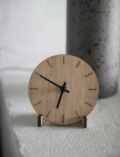 En liten och praktisk bordsklocka som passar perfekt på hyllan, nattduksbordet eller i köket. Den lilla storleken gör att den kommer att passa bra i nästan alla hem. Urtavlan är skuren i ljus ek och varje klocka är helt unik eftersom träets ådringar varierar från klocka till klocka. Klockan levereras med en praktisk klockhållare i samma träslag och du kan välja vilka visare du vill använda till klockan beroende på hur framträdande du vill att de ska vara på urtavlan.