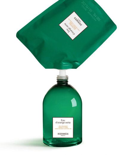 Påfyllningsflaskan är helt återvinningsbar, och den låter dig fylla glasflaskan till Eau d’orange verte skummande gel med samma mängd.