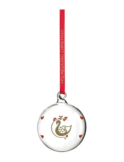 Holmegaard grundades 1825, och med årets 2025 glasprydnad firar varumärket sitt 200-årsjubileum med en design inspirerad av svanen. Denna stolta och eleganta fågel är en symbol för Holmegaard, och tillsammans med små hjärtan och en gren med röda vinterbär förmedlar årets motiv på ett vackert och dekorativt sätt transformation, skönhet och en poetisk glädje. Årets lilla julkula 2025 från Ann-Sofi Romme har en diameter på 6,5 cm och är som alltid tillverkad i munblåst glas. Färgerna hålls klassiska i rött och guld med en slutlig metallisk finish, medan de små röda hjärtana skapar en mysig atmosfär till hjärtanas fest. Den grafiska dekorationen är helt i linje med både jultraditioner och aktuella färgtrender, kompletterad med matchande röda sidenband som inbjuder till upphängning i granen, i fönstret eller på grankvistar runt om i hemmet tillsammans med resten av den nostalgiska serien. Med sin klassiska julserie för Holmegaard har Ann-Sofi Romme skapat en enkel och originell julberättelse som för många är förknippad med igenkännandets glädje och reflektioner över julens romantiska ögonblick. Varje år bygger hon vidare på det juleventyr som hon började med sin klocka för Holmegaard redan 1993.