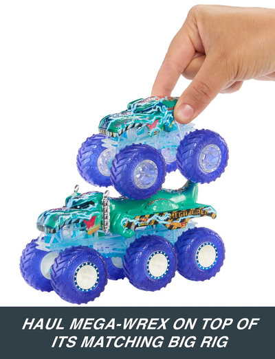 Hot Wheels Monster Trucks Power Smashers-truck och stor lastbil i multipack kombinerar fansens favoriter, Tiger Shark och Mega-Wrex, med deras motsvarande stora lastbil för episk förstörelse. Varje leksakstruck i skalan 1:64 och dess större motsvarighet har den starka och elektriska Power Smashers-dekoren som tar krockandet och kraschandet till en ny nivå precis som i YouTube Kids-serien! Bogsera Tiger Shark bakom dess stora lastbil och lasta Mega-Wrex ovanpå dess stora lastbil. Ge dig sen iväg till en häftig strid! Det här multipacket har en speciell Power Smashers-förpackning och är upphottat för lek eller visning. Färger och dekorationer kan variera.