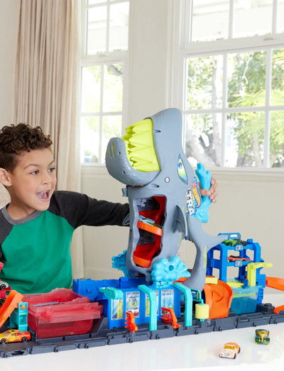 Precis som i Netflix-serien ”Let’s Race” har biltvätten i Hot Wheels City tagits över av en enorm haj som vill dyka rakt in i färgförändringarnas värld! Barnen kör det medföljande Color Reveal-fordonet över rampen och in i hajens mun, och trycker sedan på hajens huvud för att ändra vattenfärgen och få fram bilens dekor. Dra upp bilen på hajen och se hur bilen kör utför dess insida medan allt överflödigt vatten torkar bort. Knacka på hajens stjärt för att skicka ut bilar från parkeringsgaraget eller in i behållaren med iskallt vatten för en färgförändring. Ändra tillbaka bilens färger genom att köra den genom biltvätten igen. Lekdetaljer på banans bas förhöjer leken med rörliga grindar och en skumrulle, precis som i en riktig biltvätt. Setet går att vika på mitten för enkel förvaring och har ett bärhandtag för att torka överblivet vatten. Innehåller ett Hot Wheels Color Reveal-fordon. Färger och dekorationer kan variera.