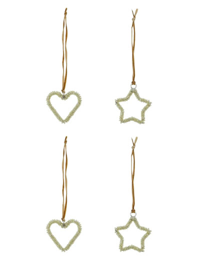 "Fira julens magi med dessa eleganta ornament i stjärn- och hjärtform. Varje set innehåller fyra ornament, två av varje design, tillverkade av hållbart järn med gnistrande glaspärlor i en silverliknande finish. Dessa dekorationer fångar julens anda och blir en vacker prydnad för din gran, kransar eller som en del av ett festligt bordsarrangemang.- Stjärn- och hjärtformade ornament.- Glaspärlor för elegant finish.- Hållbart järn för långvarig användning.- Mjuk bomullsvelour för upphängning.Låt julens symboler lysa upp ditt hem med stil och elegans."