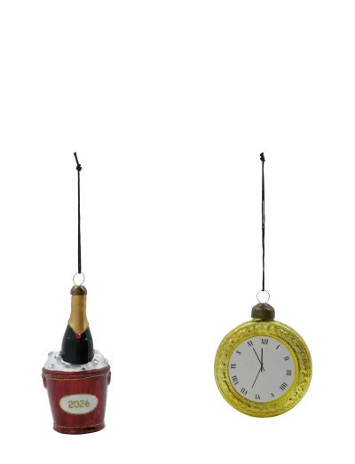 Upplev en magisk nyårsafton med dessa eleganta ornament i munblåst glas. Sättet inkluderar två unika designer: en klocka som symboliserar nedräkningen till midnatt och en champagneflaska i en kylare med årstalet 2025. Perfekta att hänga på julgranen eller en dekorativ gren, dessa ornament ger en lekfull och festlig touch till din inredning.- Munblåst glas för elegans.- Två unika och festliga designer.- Perfekt för nyår och jul.- Utmärkt som värdinnegåva.Dekorera ditt hem med stil och fira det nya året med glans!