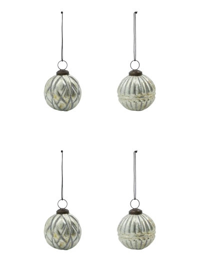Skapa en magisk julstämning med dessa eleganta julornament i antik silver. Varje set innehåller fyra handgjorda ornament, fördelade på två unika designmönster. De vackra vintagemönstren ger en klassisk och exklusiv touch till din juldekoration.- Glas för elegant utseende.- Två unika mönsterdesigns.- Hantverk med vintage känsla.- Antik silver för traditionell charm.Låt dessa ornament bli en del av din jultradition och sprid festlig glans i ditt hem!