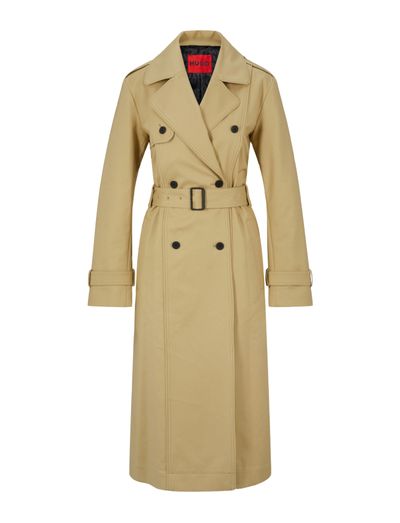 trenchcoat / regular fit / long length / belted cuffs / double breasted / fabric belt with buckle / piping detail / responsible