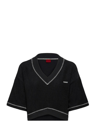 Denna topp har en V-ringning och korta ärmar, och den har en avslappnad passform. Designen avslutas med en subtil kant på halsringningen och ärmarna.