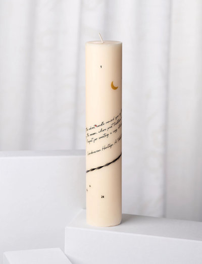CHRISTMAS CANDLEH: 25 cm x B:5 cm 100 % stearinWick made from 100% stearinNordic Swan eco-labelBurning hours: approx. 50 hoursMake the countdown to Christmas nice and cozy with this Christmas candle. The candle is made from stearin. The Christmas candle has the allergy-friendly Nordic Swan eco-label. Choose between three designs. Our Recipe of Traditions candle is made in collab with Børns Vilkår and for each candle we donate 10 DKK to Børns Vilkår.