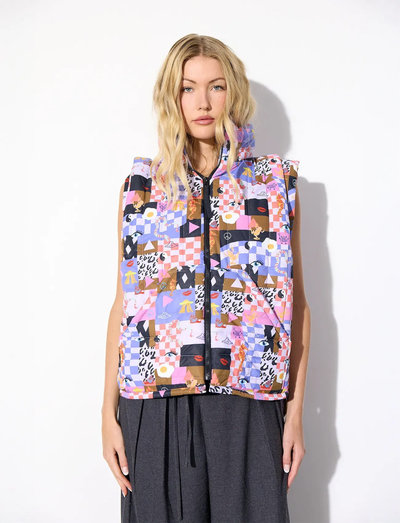 Syntetisk isoleringHunkøn Roxana Short Vest is a lightly padded vest with our vibrant Multiverse art print.It has a high collar, a front zipper closure, and two large front pockets.The slightly longer back hem adds extra coverage and a modern silhouette.Roxana Short Vest is 100% Recycled Polyester.The model is 176 cm and wears a size M.