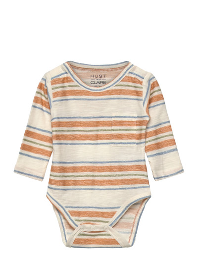 Denna mjuka och luftiga body är designad för att bäras hela dagen och är skonsam mot barns hud, vilket gör den perfekt för varma sommardagar. Designen med långa ärmar har ett randigt mönster och en praktisk bröstficka, vilket gör den till ett praktiskt och stilfullt val.